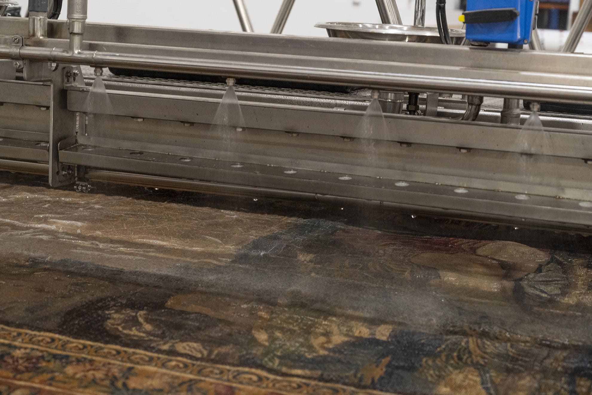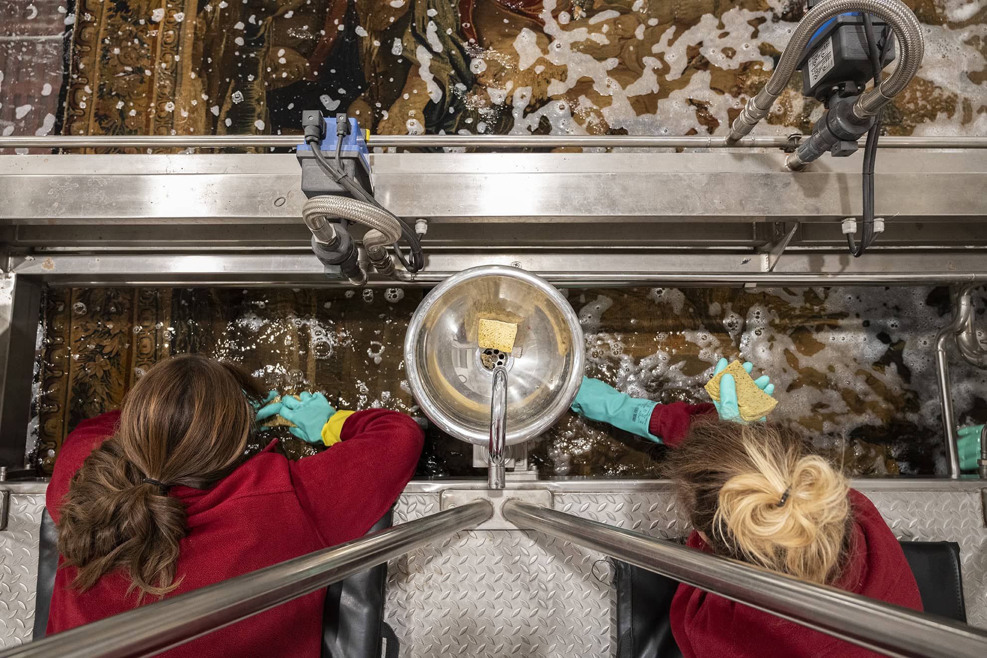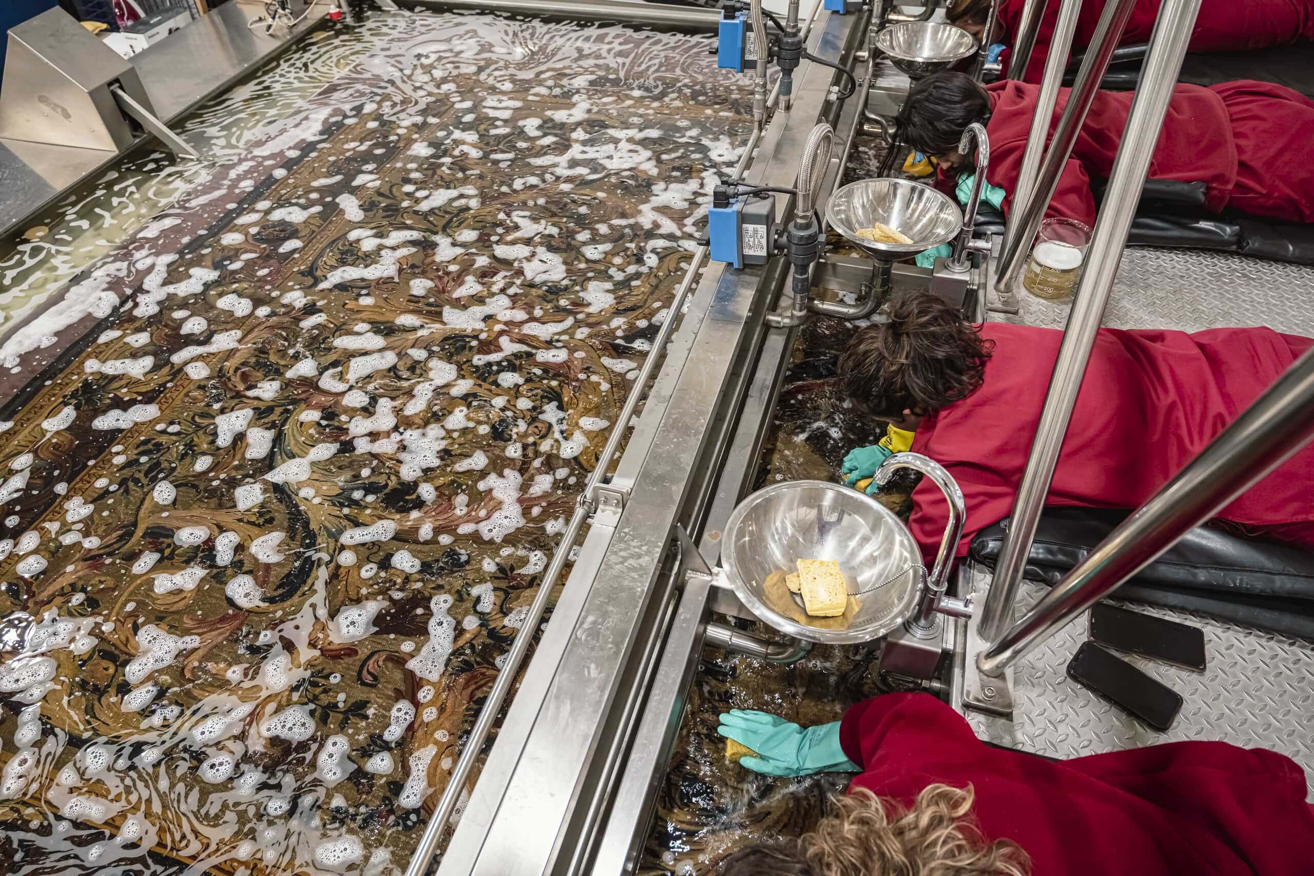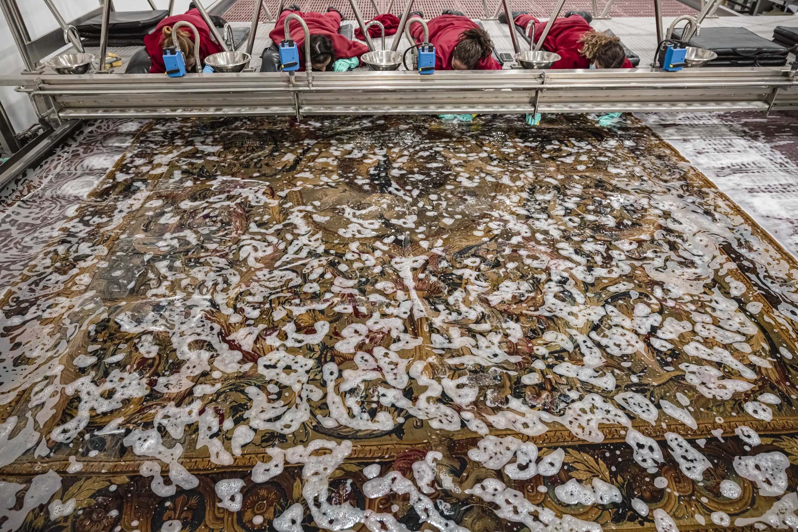La limpieza se compone de dos fases, una fase de eliminación del polvo y suciedad suelta, mediante micro aspirado con potencia controlada, y una segunda fase para eliminar la suciedad que ha profundizado en la estructura de la fibra. Este proceso de limpieza química o lavado acuoso se realiza previas pruebas de estabilidad de todos los tintes. El sistema de “inmersión controlada”, por el que apostamos en la Real Fábrica de Tapices, minimiza los riesgos propios de lavado y garantiza la completa eliminación de la suciedad depositada por medio de la utilización de un tensioactivo de calidad farmacéutica y origen natural.