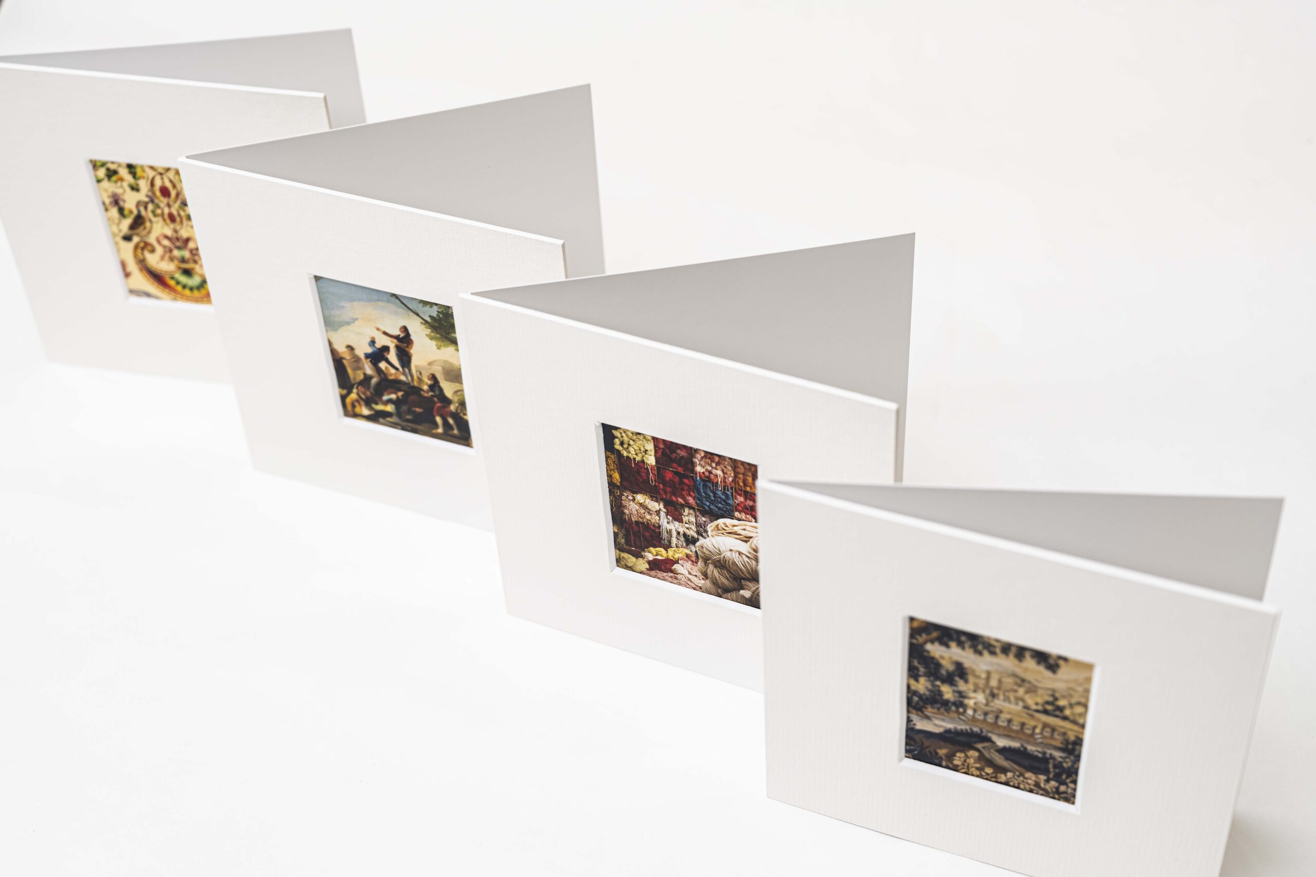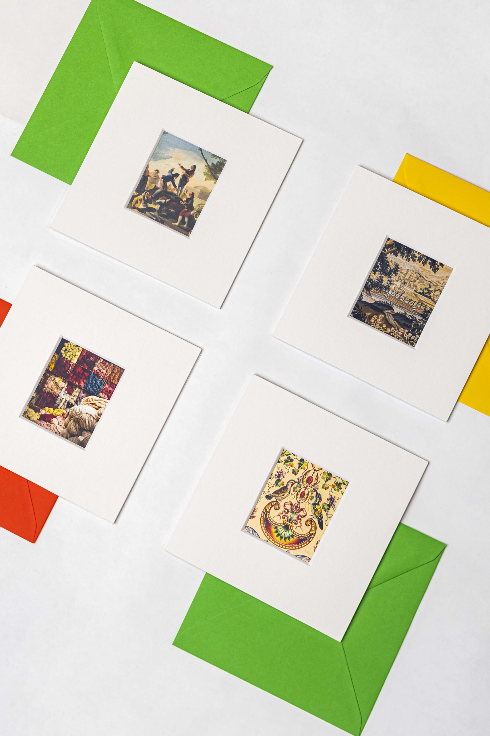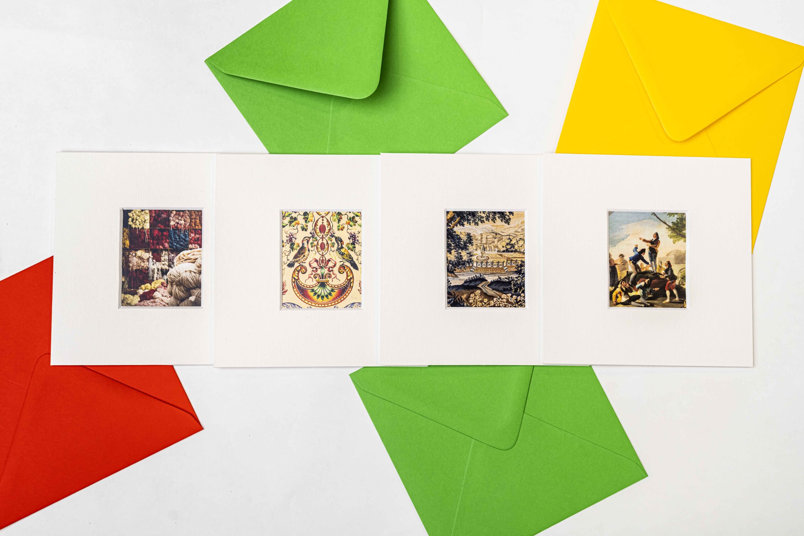 Tarjetas postales con cuatro diseños distintos de cartones y bocetos de la Real Fábrica de Tapices.
