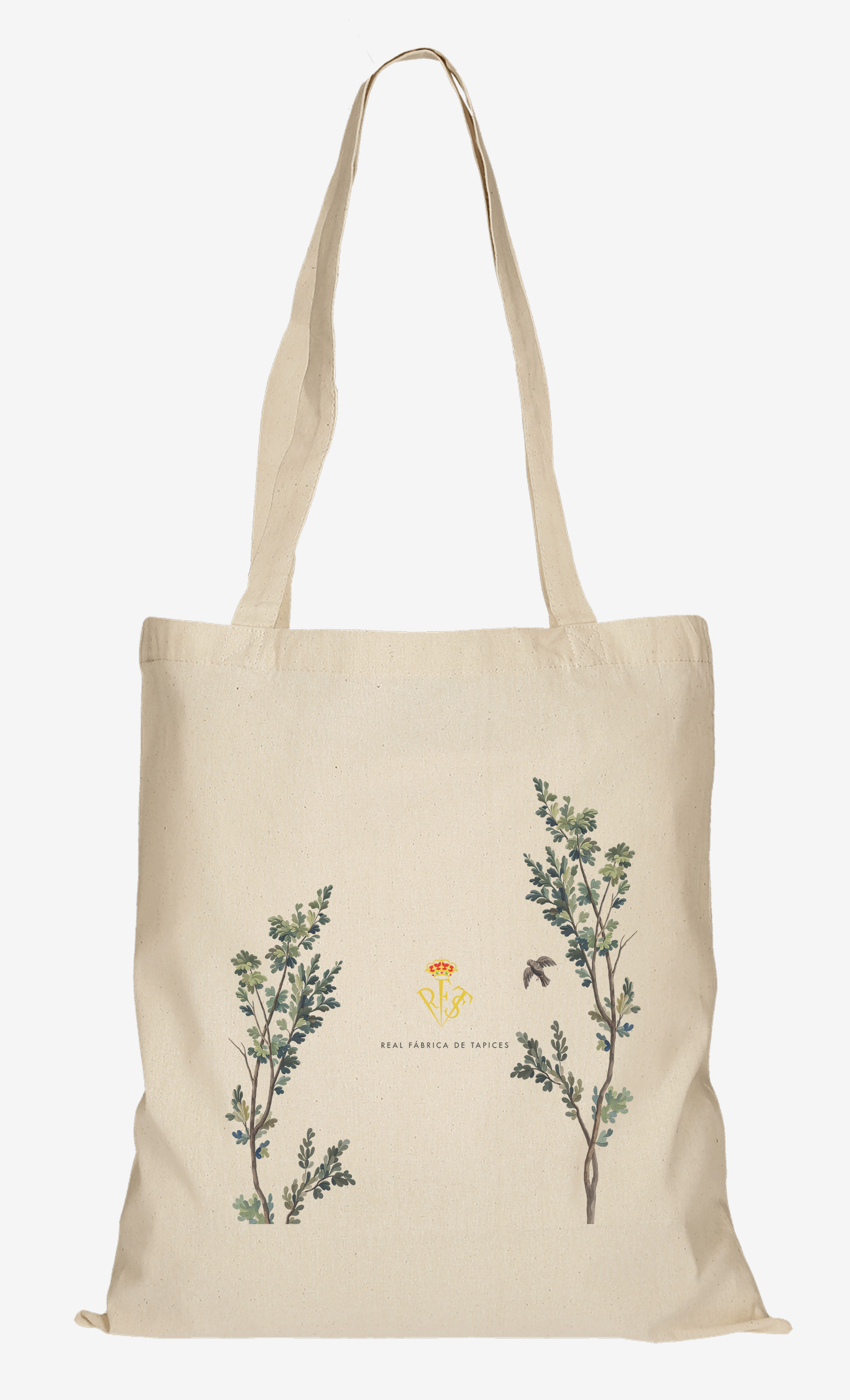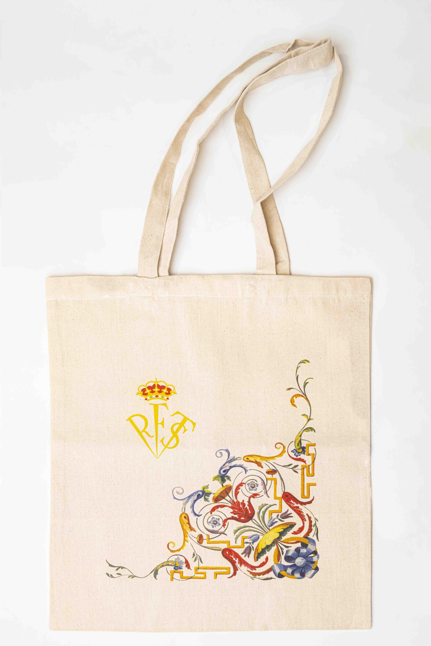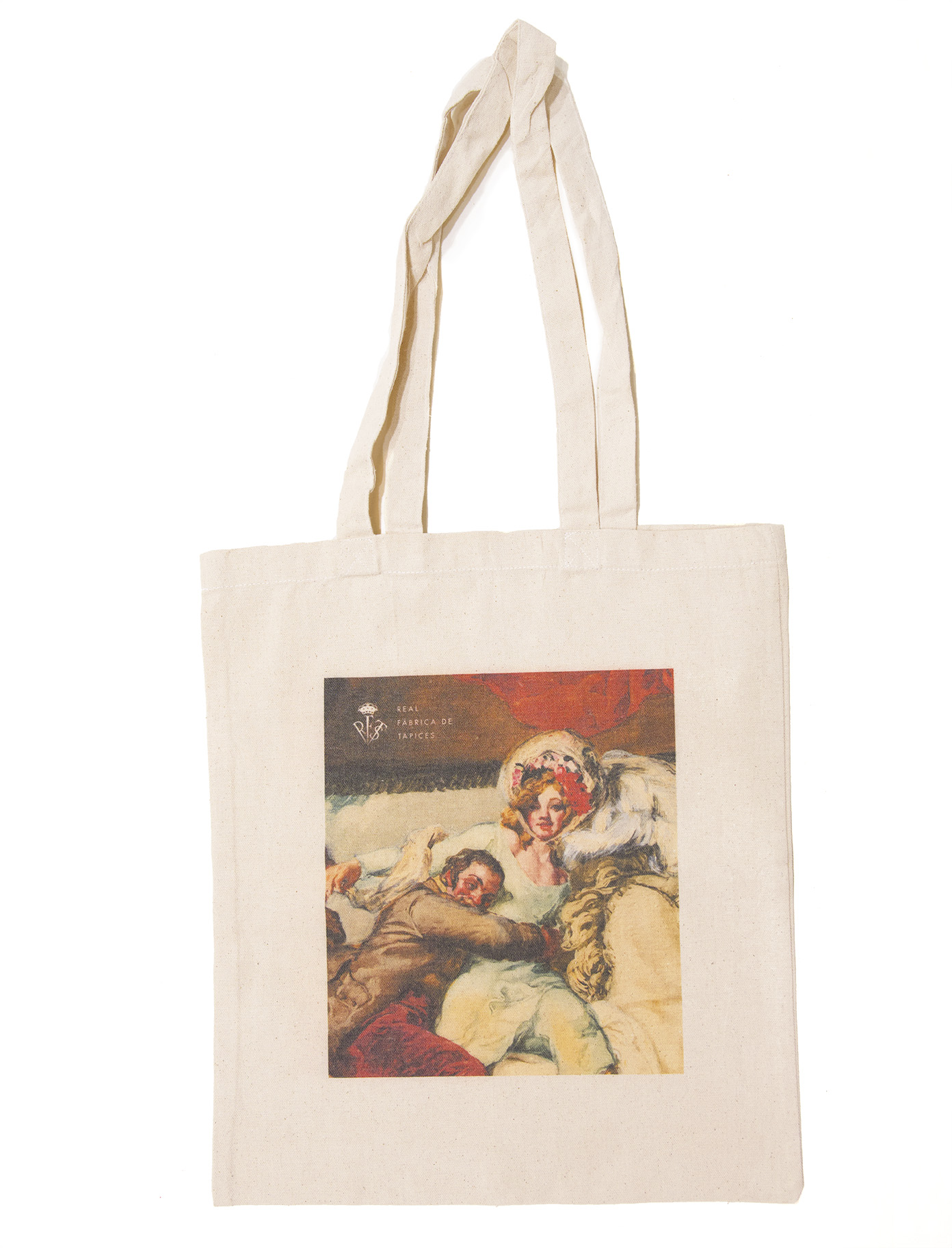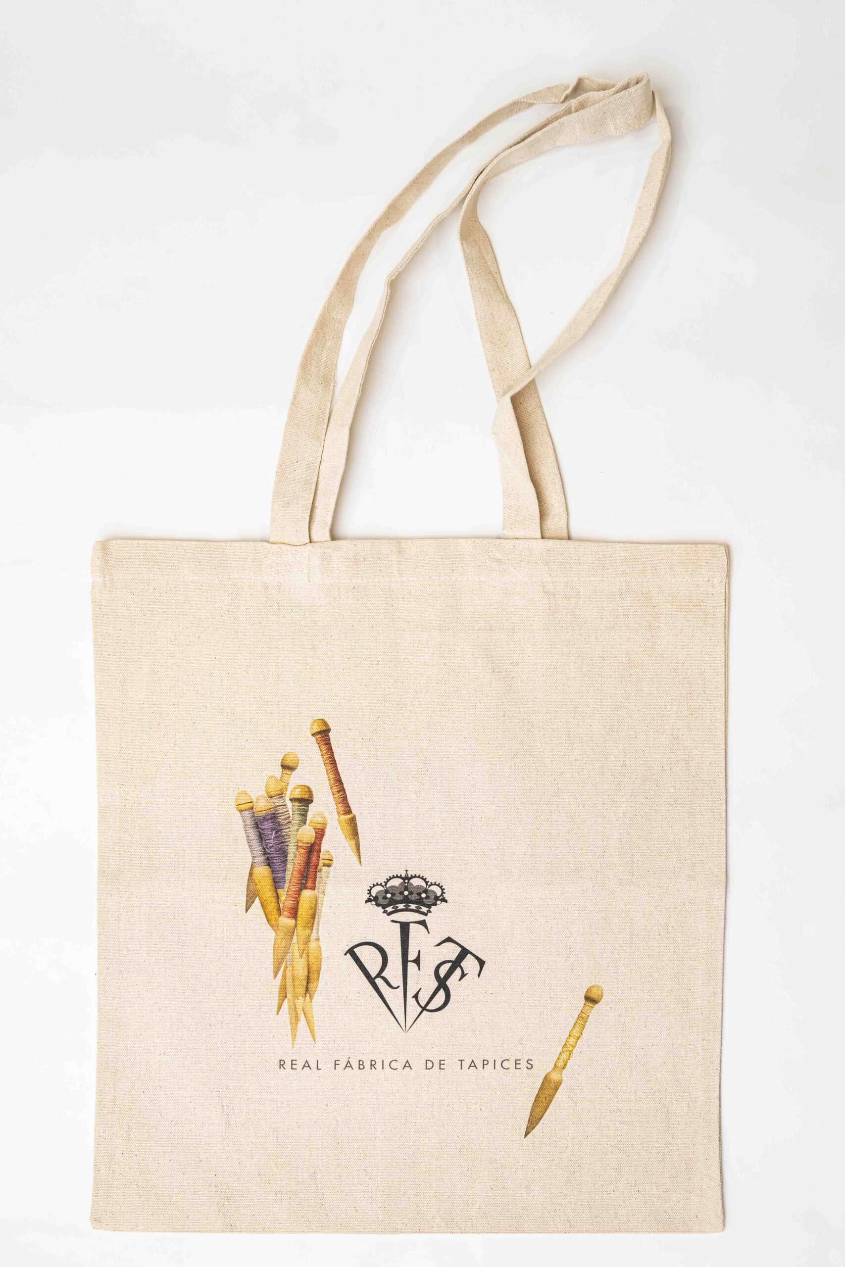 Clásica bolsa de tela de color beige con diferentes diseños y motivos representativos de la Real Fábrica de Tapices en la parte central.