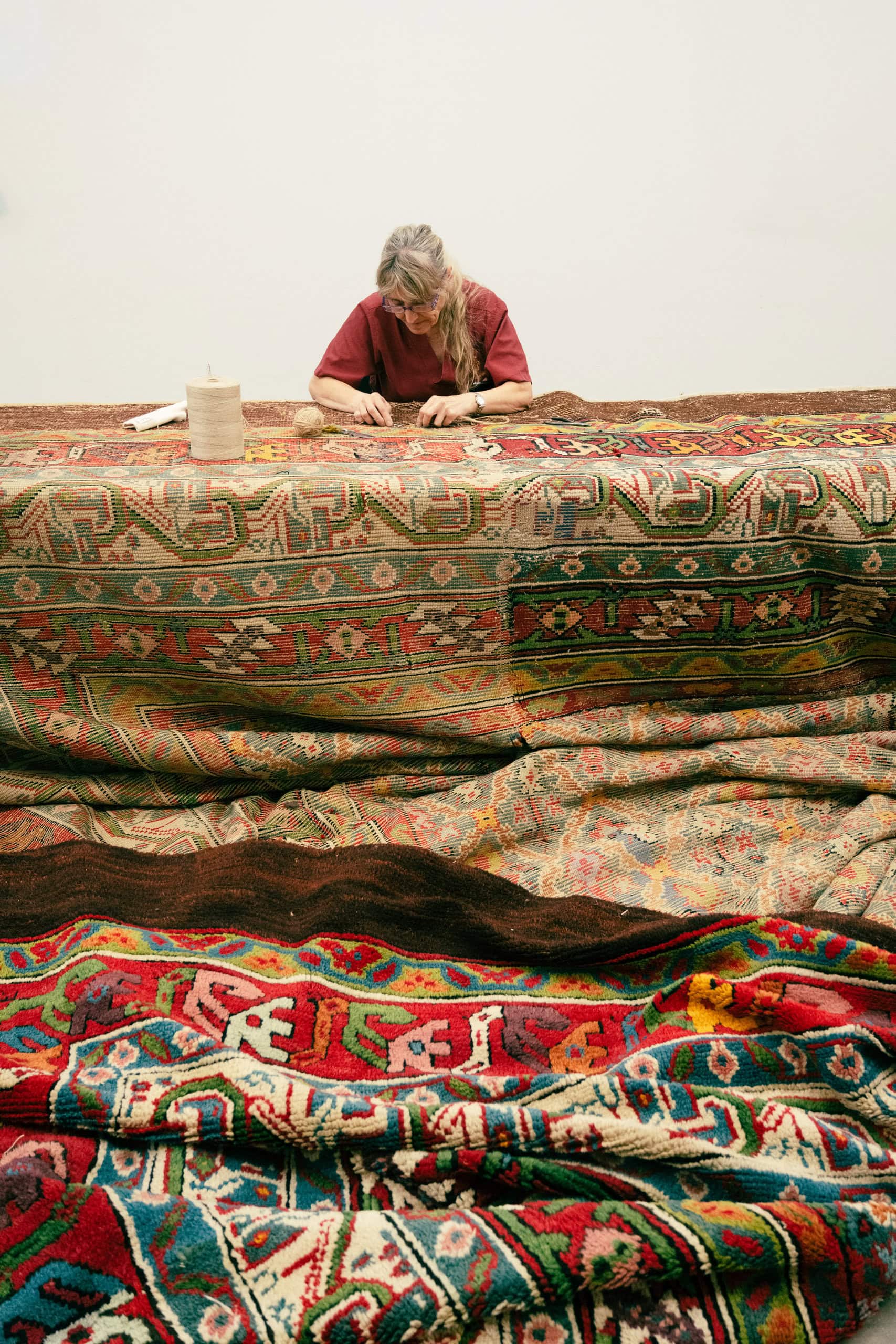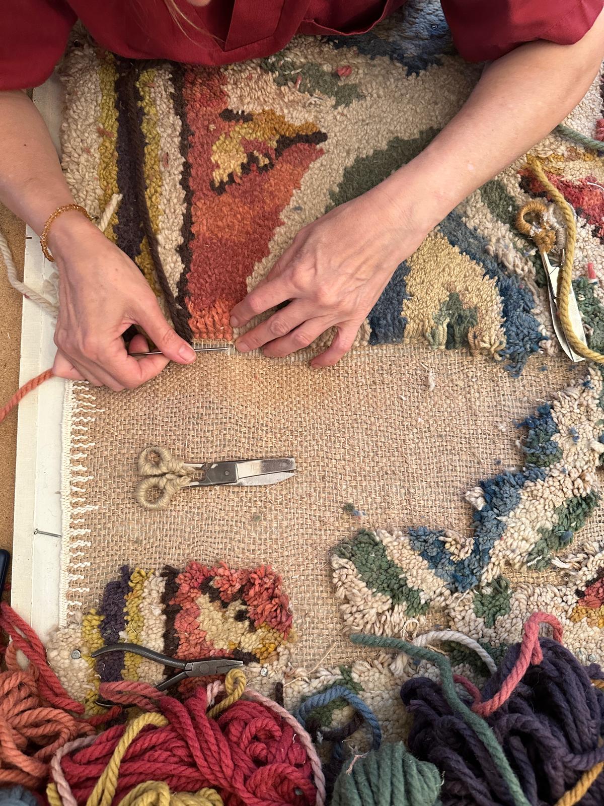 Por ello, la Real Fábrica de Tapices dispone de un equipo de especialistas que reintegran la estructura interna de la alfombra. Si fuera necesario, se sustituyen los nudos deteriorados por nuevo material, garantizando así un resultado estético y duradero.
