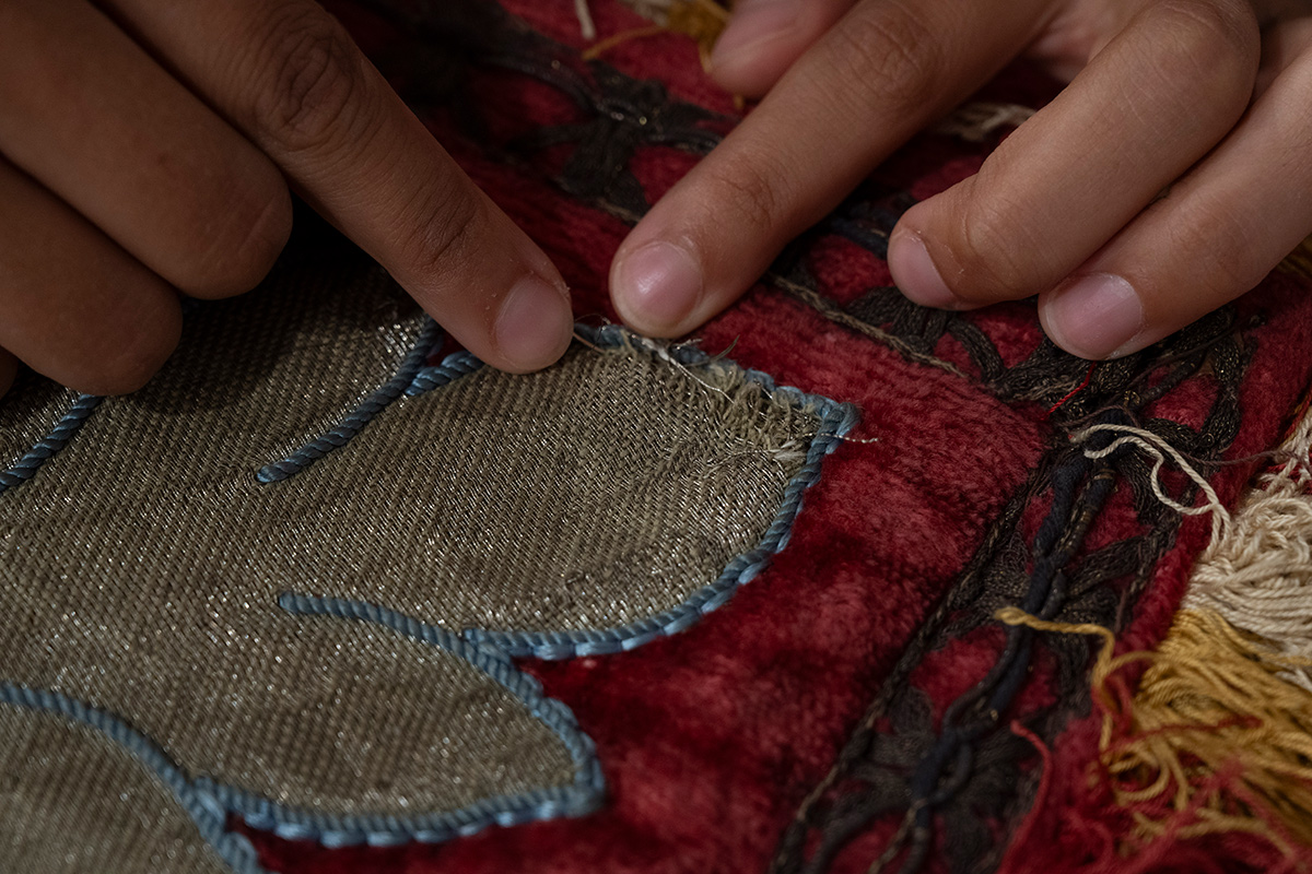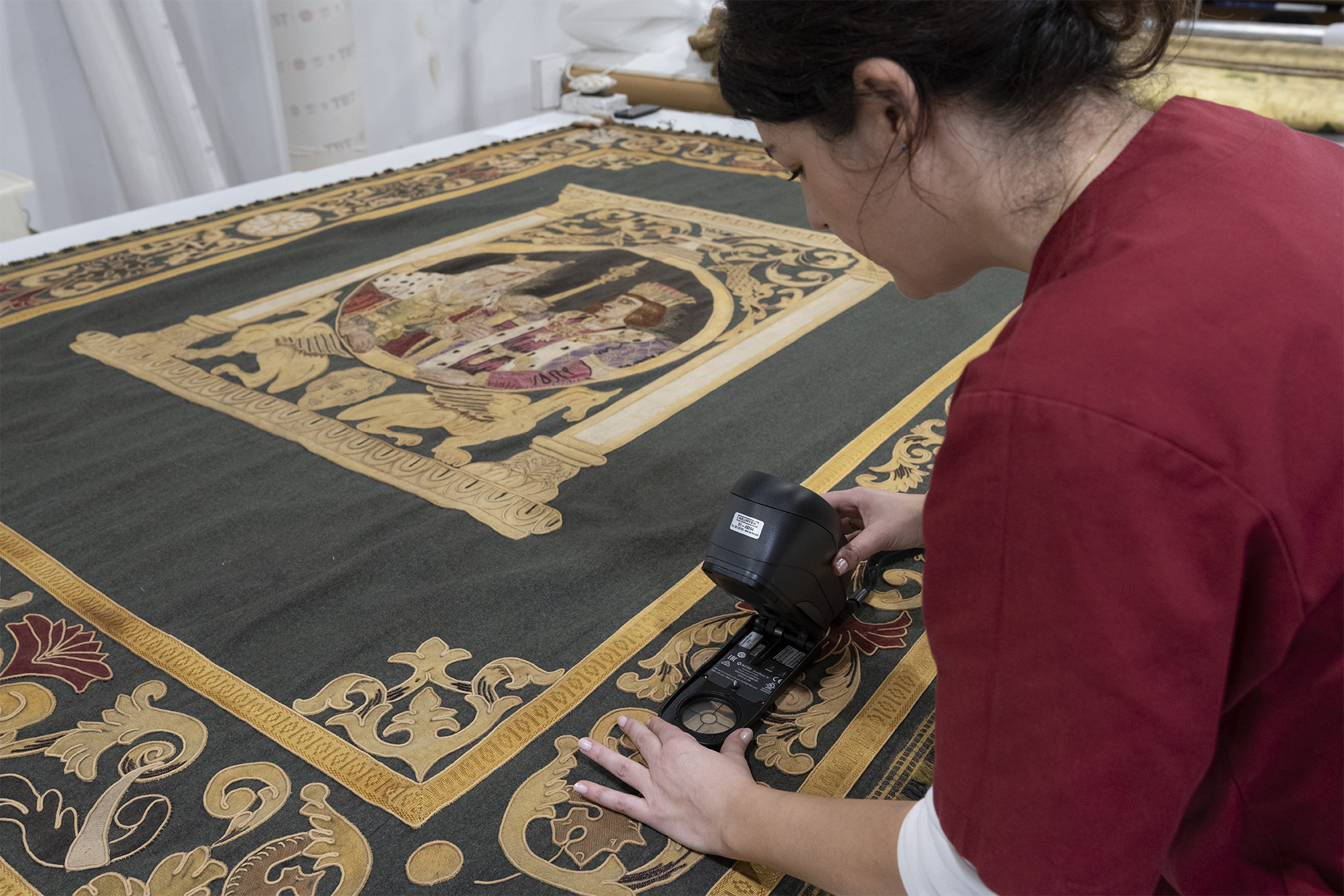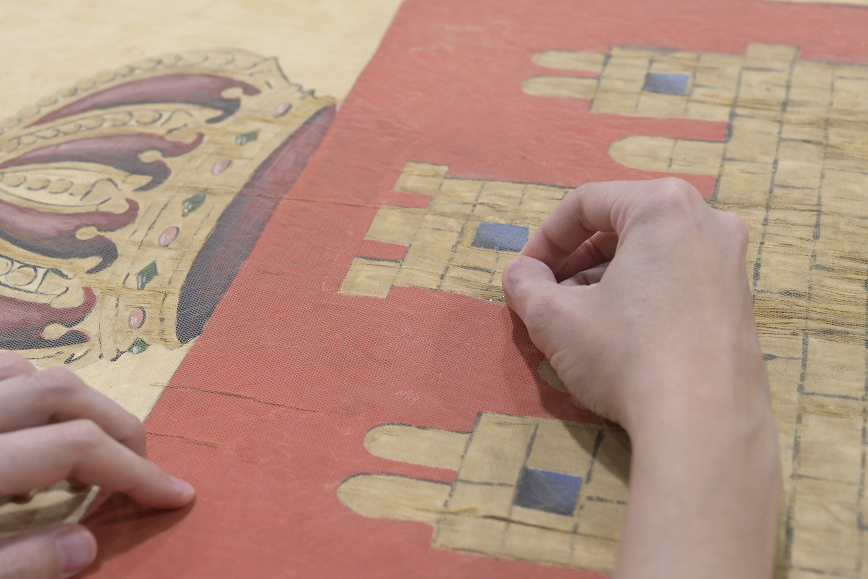 En la Real Fábrica de Tapices somos especialistas en la limpieza, conservación y restauración de reposteros. Estas piezas textiles, tradicionalmente utilizadas para engalanar muros y espacios institucionales, se caracterizan por mostrar escudos de armas, linajes nobiliarios y otros motivos heráldicos que aportan solemnidad y representación.