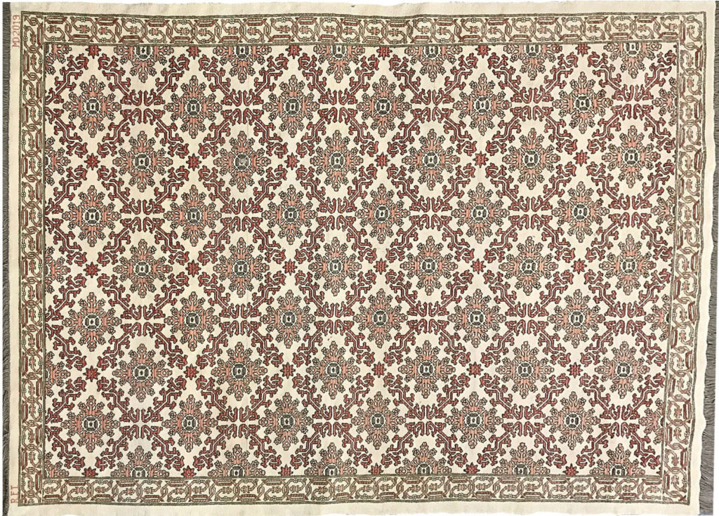 Muchos artistas y diseñadores reconocidos han colaborado durante años en el diseño de nuestros tapices y alfombras para que te puedas llevar un producto de lujo acorde con el prestigio de la histórica manufactura madrileña, entre ellos Alfonso Albacete, Alberto Corazón, Manolo Valdés o Teresa Sapey (en la imagen). También contamos con exclusivos diseños clásicos realizados por nuestros dibujantes que ya representan toda una trayectoria estética en la historia de la Real Fábrica de Tapices. Más de 2000 dibujos y plantillas para alfombra componen nuestro archivo gráfico, sentando un precedente y una identidad propia para nuestra marca. La técnica empleada para la elaboración de estas alfombras es el «nudo turco».